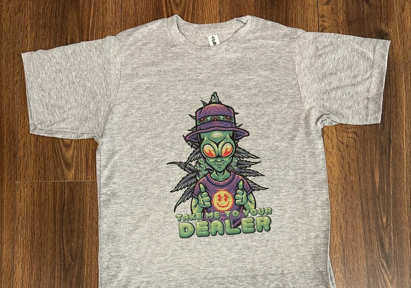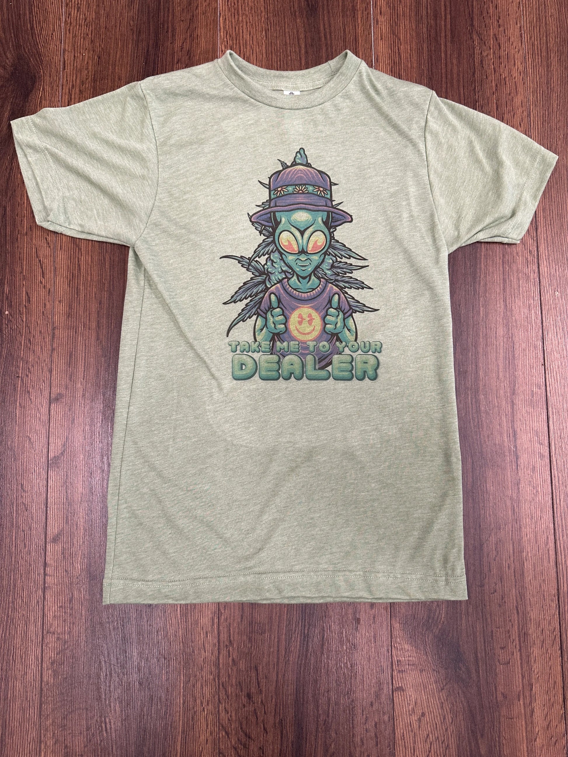 This funny shirt has an image of an illustration of an alien with a purple shirt, has a bud in the background and says "Take me to your Dealer" on it. A funny take on the "Take me to your leader" saying. Extra soft tri-blend shirt with a detailed image on the front.